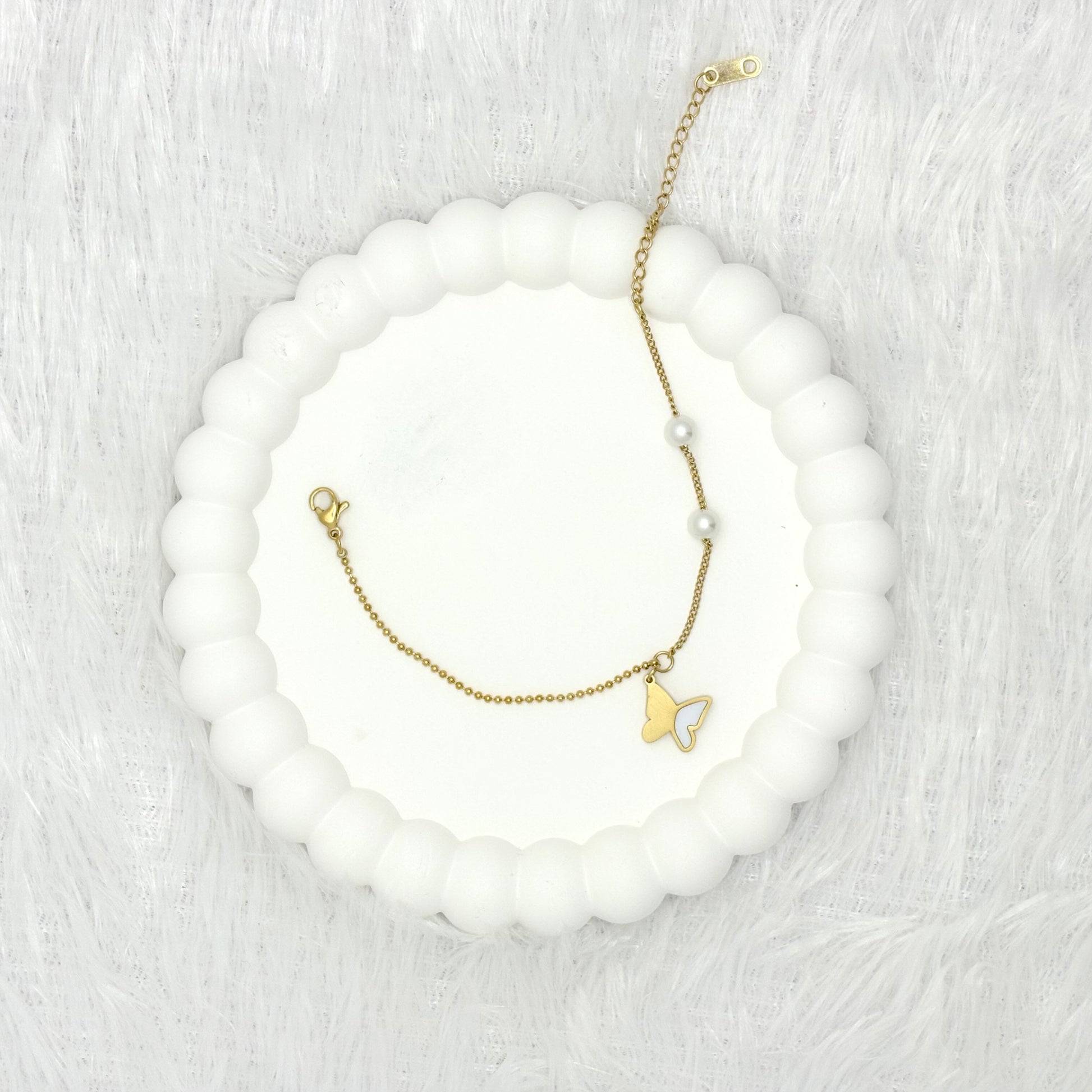 Whether you're dressing up for a night out or adding a touch of elegance to a casual outfit, the Delicate Butterfly and Pearl Charm Bracelet is a timeless accessory that will elevate your style.