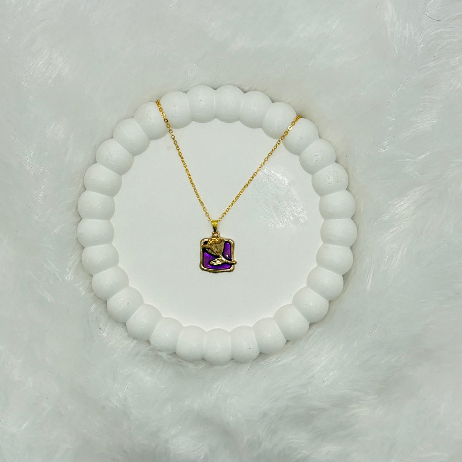 Whether you're dressing up for a night out or adding a touch of elegance to a casual outfit, the Vibrant Purple Enamel Rose Pendant Necklace is a timeless accessory that will elevate your style.